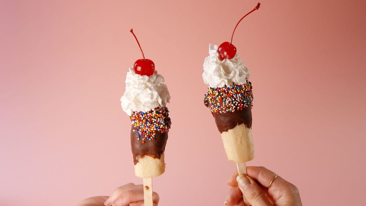 5. Step 5Top each pop with whipped cream and garnish with a maraschino cherry.